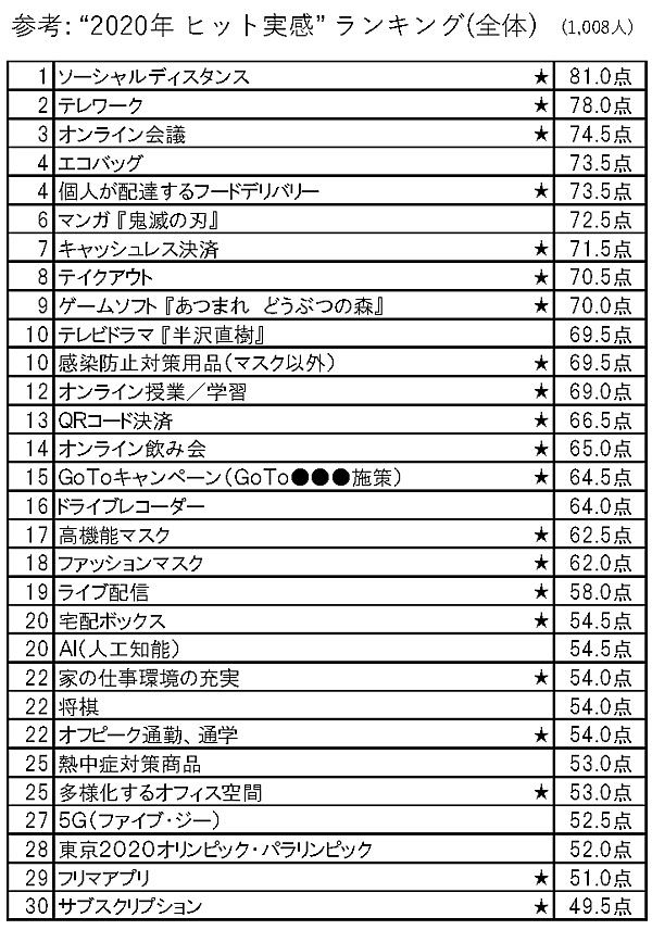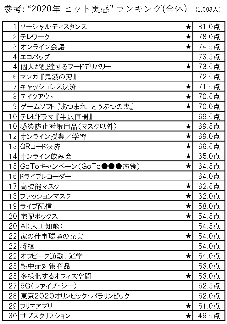 「2020年ヒット実感」については、「ソーシャルディスタンス」81.0点が1位。「テレワーク」78.0点、「オンライン会議」74.5点がそれに続き、コロナ禍を色濃く感じさせる結果となった。映画の大ヒットであらためて注目を集めている「鬼滅の刃」も6位にランクインしている。