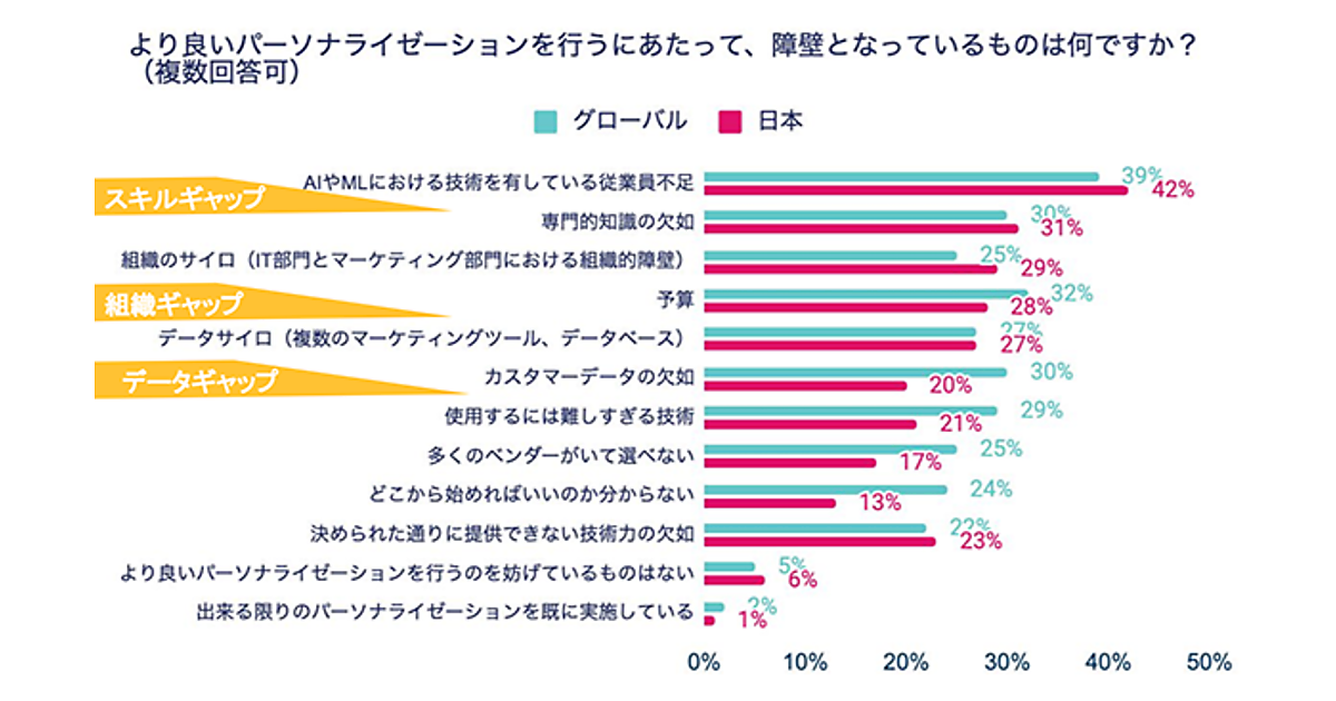 「パーソナライゼーション」の導入を意識しているが、行うにあたって企業が感じている障壁が多数あることが今回の調査でわかった。障壁のTOP3は「AIやMLにおける技術を有している従業員の不足」42%、「専門的知識の欠如」31%、「組織のサイロ(IT部門とマーケティング部門における組織的障壁)」29%である。