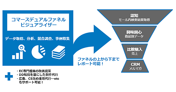 コマースデュアルファネルビジュアライザーは、ECモール内の多様な顧客行動データを収集・分析して、顧客の認知から興味関心、購入に至る新規顧客の獲得と、ロイヤル化で他社商品に流れない既存顧客育成の「デュアルファネル」を網羅的に可視化する。競合を含めた検索順位結果や商品単位のレビュー、購買後の既存顧客向けメールマガジン施策の効果検証など事前設定して抽出し、自動でレポート生成する。