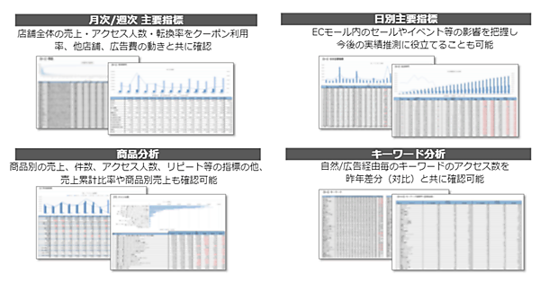 第1弾で「楽天市場」と「Yahoo!ショッピング」に対応した。他のECモールや「Shopify」などSaaS(サービスとしてのソフトウェア)活用の自社ECサイト分析、API開発にも今後対応する。ECモール内にショップを開設していない企業や量販店、卸売業者も競合比較で出品商品の露出状況やレビューを確認して売上改善施策に生かせる。ECサイト業務の煩雑さで精緻な検証ができていない企業の課題を解消する。