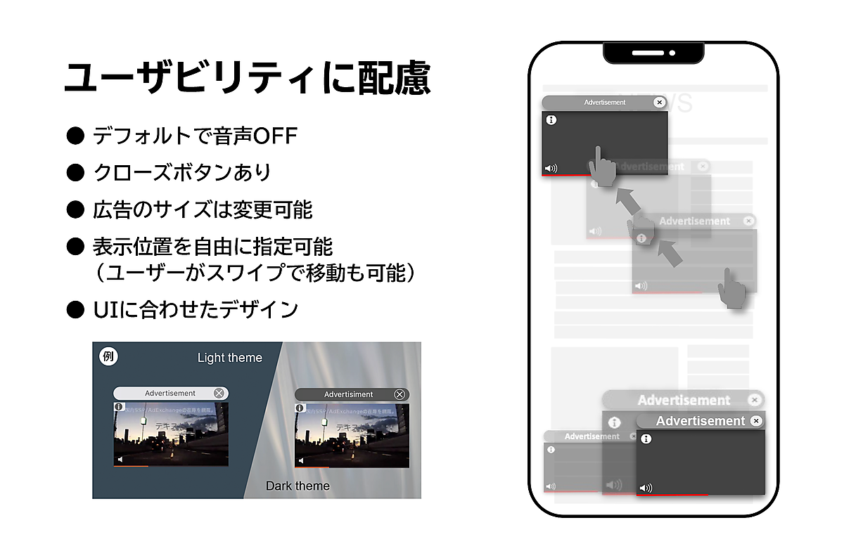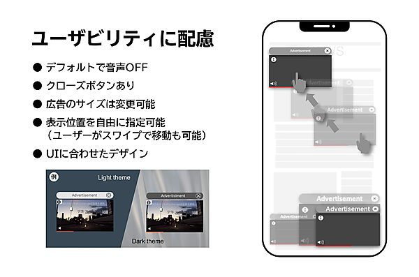 Wipe Adは、オーバーレイで動画を配信するピクチャー・イン・ピクチャー形式の広告フォーマット。動画広告のサイズや表示位置を媒体社のアプリ仕様にあわせて自由にカスタマイズでき、デフォルト音声OFFやクローズボタンの配置のほか、ユーザーが動画広告の位置をスワイプで自由に動かせる。アプリのUI(ユーザーインターフェース)に合わせた2つの配色から広告枠の色を選べる。