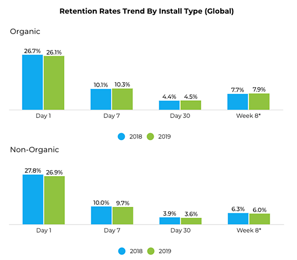 ASOによるアプリストアの検索対策はユーザー獲得で重要性を持っている。米国Appleによると「App Store」検索を利用するユーザーは全体の70%で、65%は検索の後に直接アプリをダウンロードする。モバイルアプリ広告効果測定プラットフォームのAppsFlyerによると、リテンションレート(アプリの利用継続率)は7日後以降の長期になるほどオーガニック検索経由のほうが非オーガニックユーザーより継続率が高い。