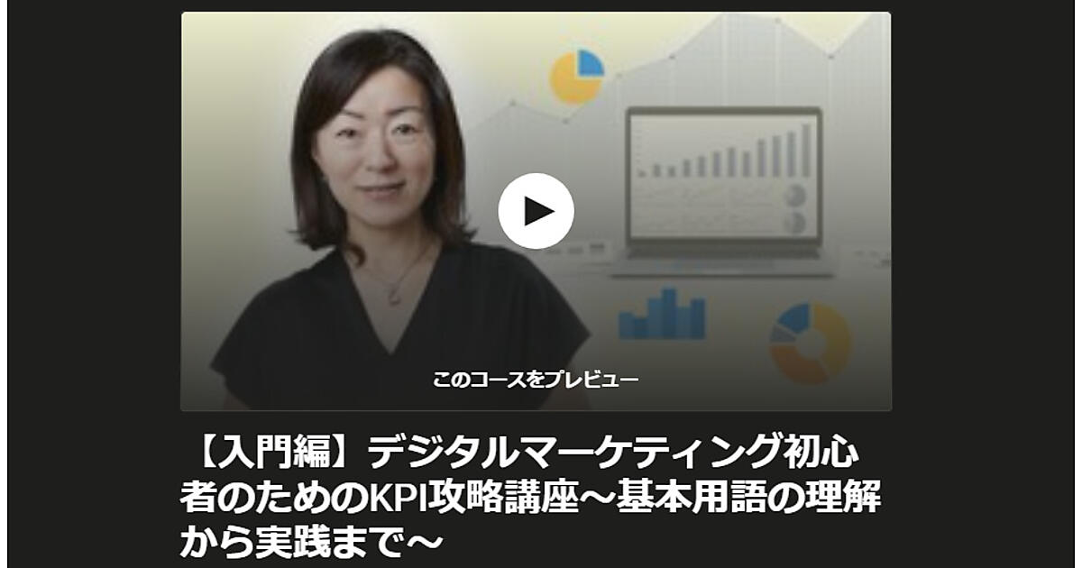 本講座は、データドリブンマーケティングの基本である「KPI」の設定方法から目標達成までのフローが学べる内容で、Webマーケティング、デジタルマーケティングを始めたい方、基礎から学びたい方に向けた内容となっている。また、Excelを使った実践パートもある。