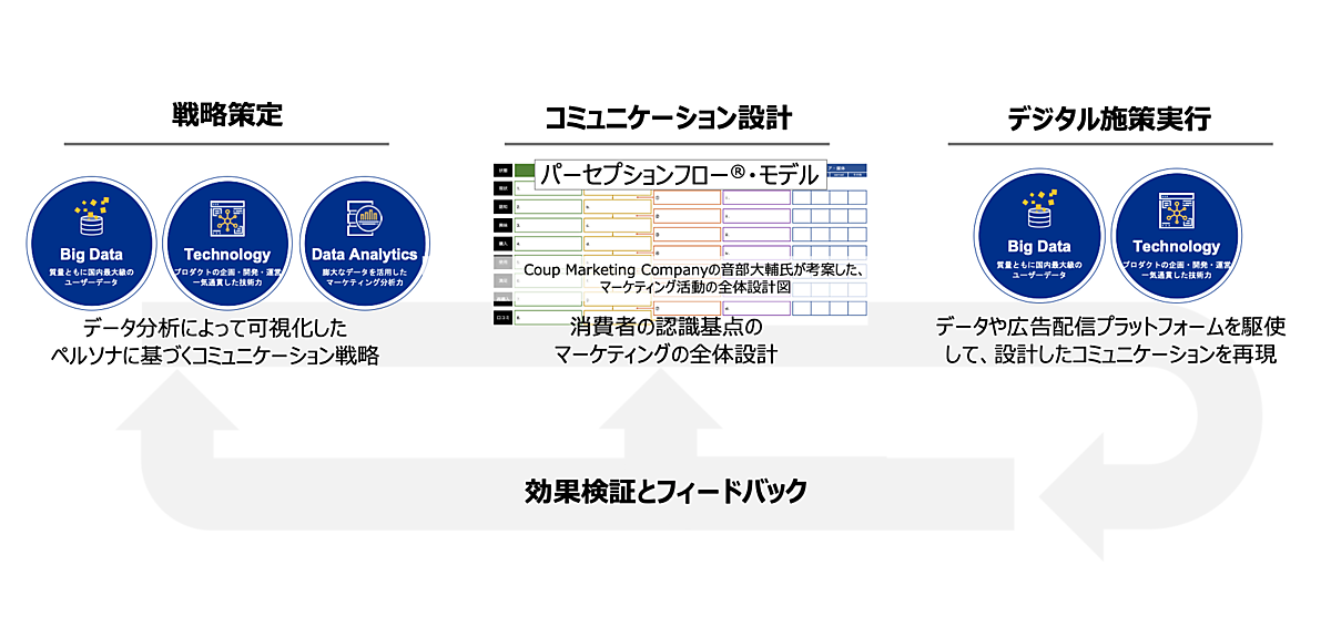 主観のマーケティングから脱却して施策のムダ打ちを回避し、データドリブン(データ分析に基づく行動)によって課題を解決する。①ビッグデータを活用した分析とコミュニケーション戦略策定②パーセプションフロー(自然な認識変化の流れ)モデルによるコミュニケーション設計③デジタル施策の実行--の効果検証とフィードバックを繰り返す。