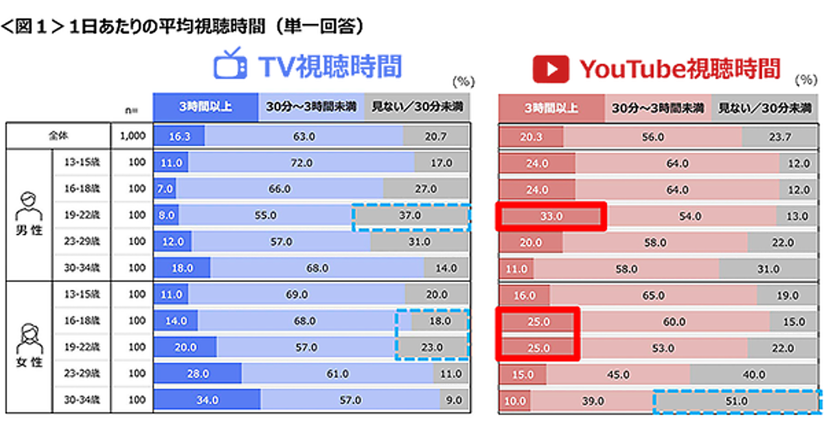 男性19~22歳・女性16~22歳で進むTV離れ、一方女性30代は3時間以上テレビを見る人が34.0%