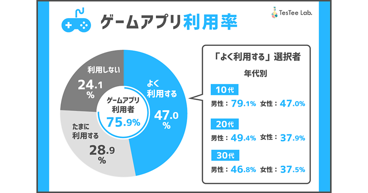 まず全体に「ゲームアプリの利用状況」を聞くと、「よく利用する」と回答した人は47.0%、「たまに利用する」28.9%、「利用しない」24.1%となった。計75.9%がゲームアプリの利用経験があることとなる。年代別で見ると、やはり10代男性が圧倒的に多く、「よく利用する」だけで79.1%に達している。この傾向は、プレイ頻度で見ても同様だ。