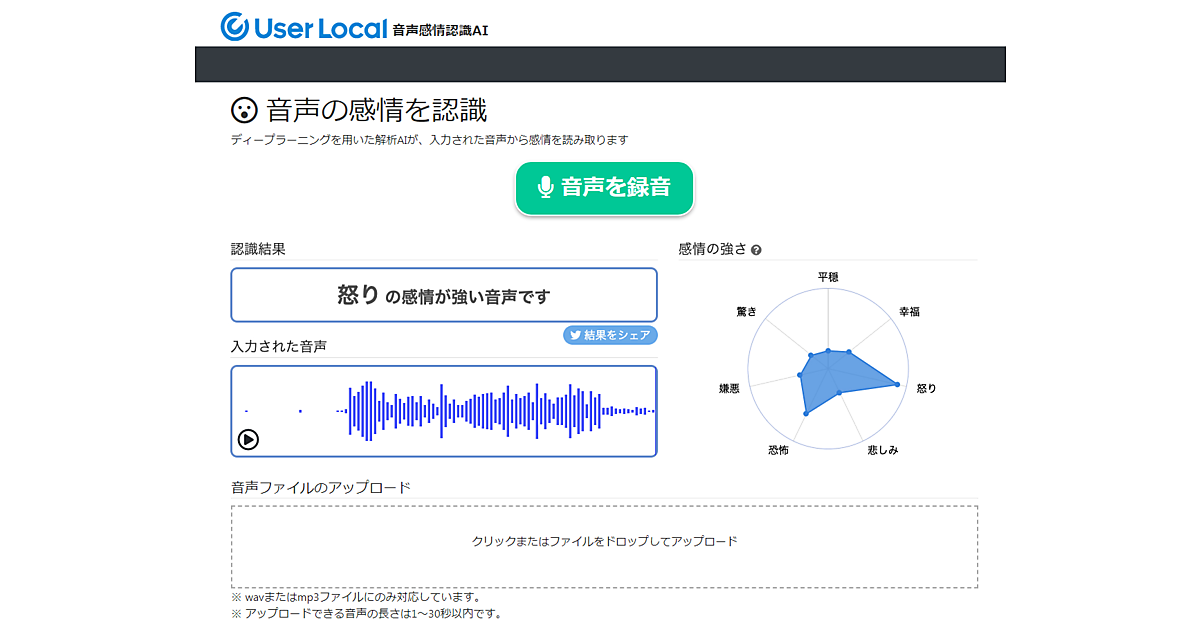マイクが付いたパソコンを使ってウェブブラウザでサイトにアクセスし、数秒の声を録音することで利用できる。認識可能な音声の長さは1~30秒。マイクでの音声入力に加え、声が入った「WAV」「MP3」のファイルのアップロードにも対応している。AIが各感情に分類し、それぞれの成分を数値化したりグラフ化したりできる。