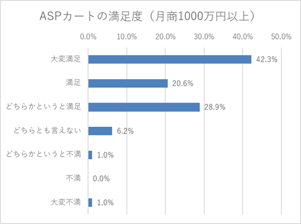 そして、これら「自社が使っているカートシステムに対する評価」を聞くと、月商1000万円未満のネットショップでは「満足」39.4%、「どちらかというと満足」29.3%、「大変満足」16.2%の順だったが、月商1000万円以上のネットショップでは「大変満足」42.3%、「どちらかというと満足」28.9%、「満足」20.6%の順となった。月商1000万円以上のネットショップ担当者のほうが満足度が高いといえる。また前述のとおり、月商1000万円以上のネットショップは「EC-CUBE」の利用が多く、それに十分満足しているという現状が伺える。