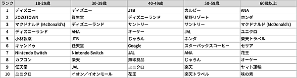 年齢別で見ると、若年層は「娯楽・ゲーム・エンターテインメント」業種が上位で、年齢とともに「食品」「日用品/雑貨販売店」などが増え、30~50代は「旅行・交通」などのブランドがランクインした。幅広く3年代区分でランクインしたのは、「ディズニーランド」「ユニクロ」「JAL」「ANA」の4ブランドだった。