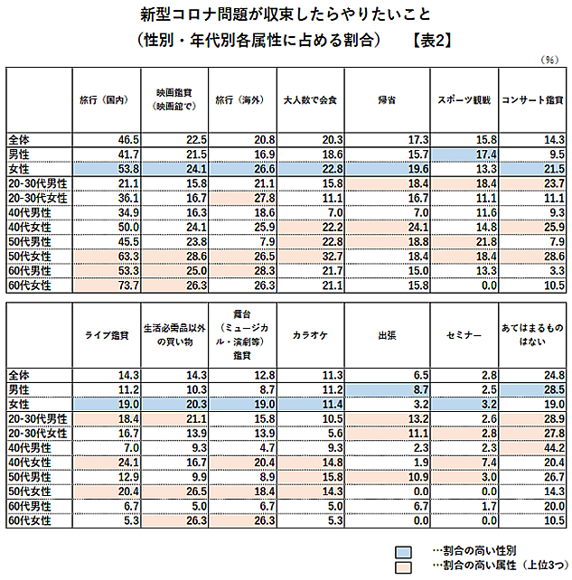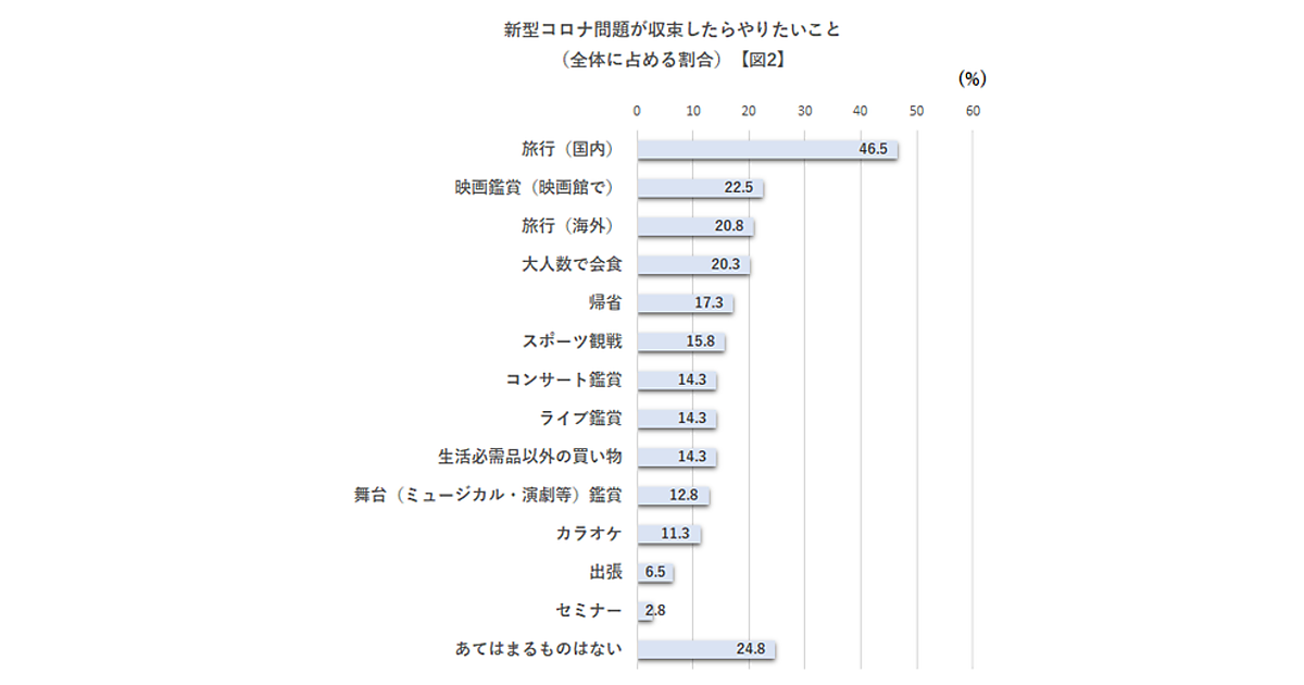 - 新型コロナウイルス感染症問題が収束したらどんなことをしたいかを、旅行(海外)/旅行(国内)/大人数で会食/コンサート鑑賞/ライブ鑑賞/スポーツ観戦/舞台(ミュージカル・演劇等)鑑賞/映画鑑賞(映画館で)/カラオケ/生活必需品以外の買い物/帰省/出張/セミナー/あてはまるものはない、より複数回答。