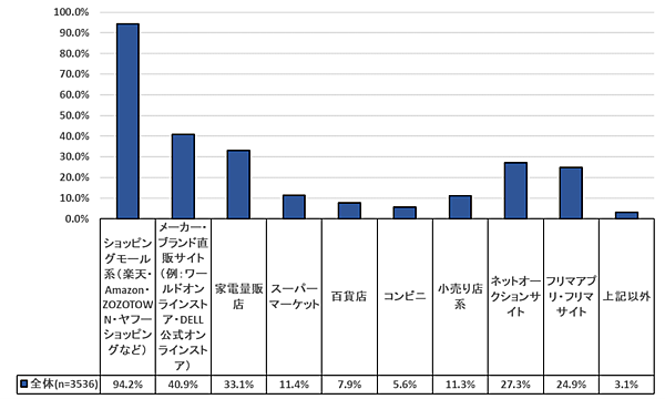 まず事前調査として「オンライン通販での商品購入の経験」を聞くと、回答者4,120人中、購入経験者は86%、未経験者は14%だった。購入経験者(3,536人)に「実際に利用したことのある通販サイト」を聞くと、「ショッピングモール系サイト(楽天やAmazonなど)」が94.2%で最多。「メーカー・ブランド直販サイト」40.9%、「家電量販店サイト」33.1%、「スーパーマーケットサイト」11.4%がそれに続いた。