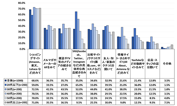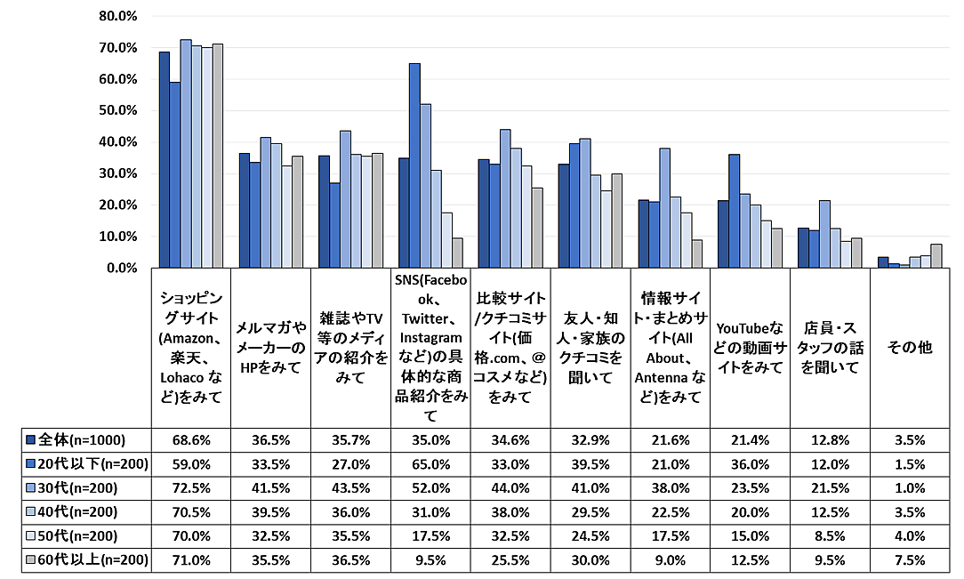 商品を欲しいと思うきっかけ、全体では「ショッピングサイト」、若年層では「SNS」