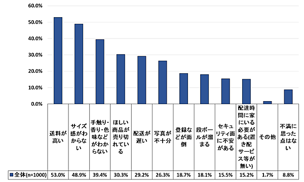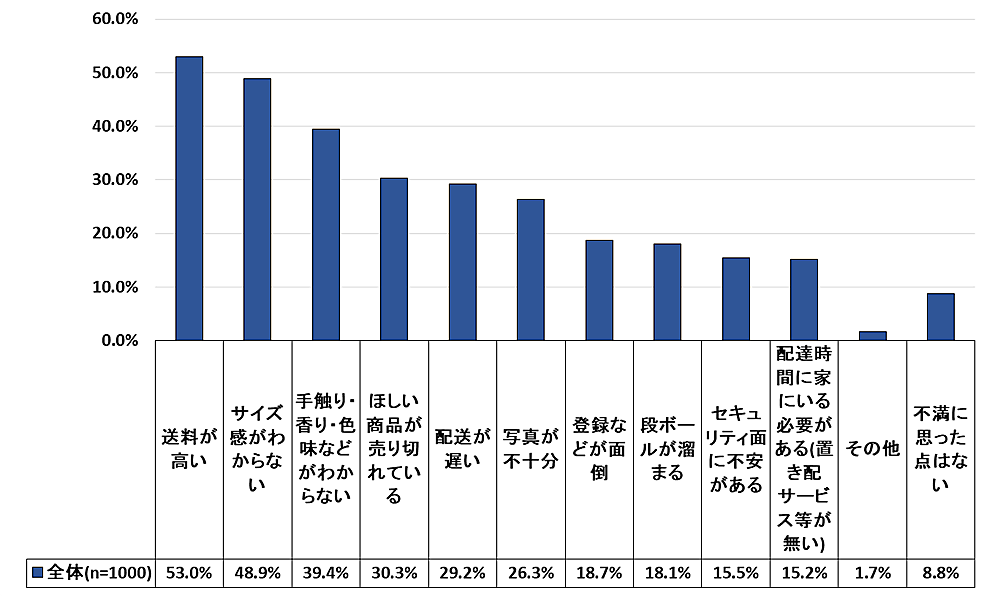 次に「メーカー直販サイトでオンラインショッピングをしていて不満に思うこと」などを聞くと、「送料が高い」53.0%が、「サイズ感がわからない」48.9%が1位だった。オンラインショッピング特有の“実物を触れない”という不満より、コスパが気になる利用者が多いようだ。直販サイトで特にネックになりそうな「登録などが面倒」は18.7%に留まっている。