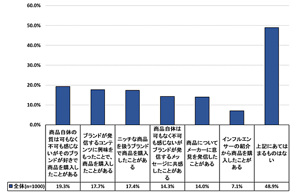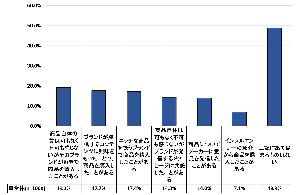 「これまでに経験した購買行動」では、「商品自体の質は微妙だがそのブランドが好きで商品を購入したことがある」19.3%、「ブランドが発信するコンテンツに興味をもったことで、商品を購入したことがある」17.7%、「ニッチな商品を扱うブランドで商品を購入したことがある」17.4%が、あてはまった人の上位だった。