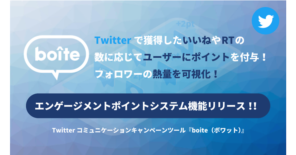 SNSマーケティング支援のテテマーチは、「Twitter」を活用した同社の企業キャンペーン支援ツール「boite(ボワット)」に「エンゲージメントポイントシステム機能」を新たに追加した、と11月27日に発表した。運用で獲得したエンゲージメント(顧客との関係)をポイント化してユーザーとのコミュニケーションを最大化する。