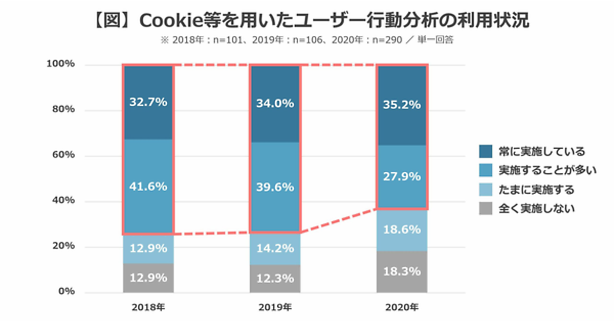 まず、「Cookie等を用いたユーザー行動分析をどの程度利用しているか」の頻度を聞くと、「常に実施している」35.2%は前年からほぼ横ばいながら、「実施することが多い」27.9%が前年から10ポイント以上減少。「たまに実施する」「全く実施しない」という層が増加した。