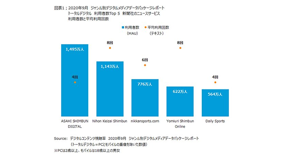 それによると、トータルデジタルでの月間利用者数は「朝日新聞デジタル」1,495万人が最多。以下「日本経済新聞」1,143万人、「日刊スポーツ」776万人が続く(PCとモバイルの重複を除く)。