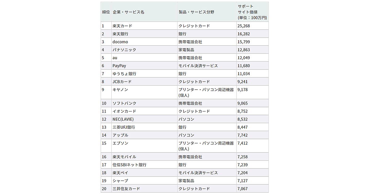 調査によると、最も金額が高かったのは「楽天カード」で、サイト上での問題解決により252億6,800万円相当の価値と推定された。同様の計算で、2位「楽天銀行」162億8,200万円、3位「docomo」157億9,900万円と算出された。