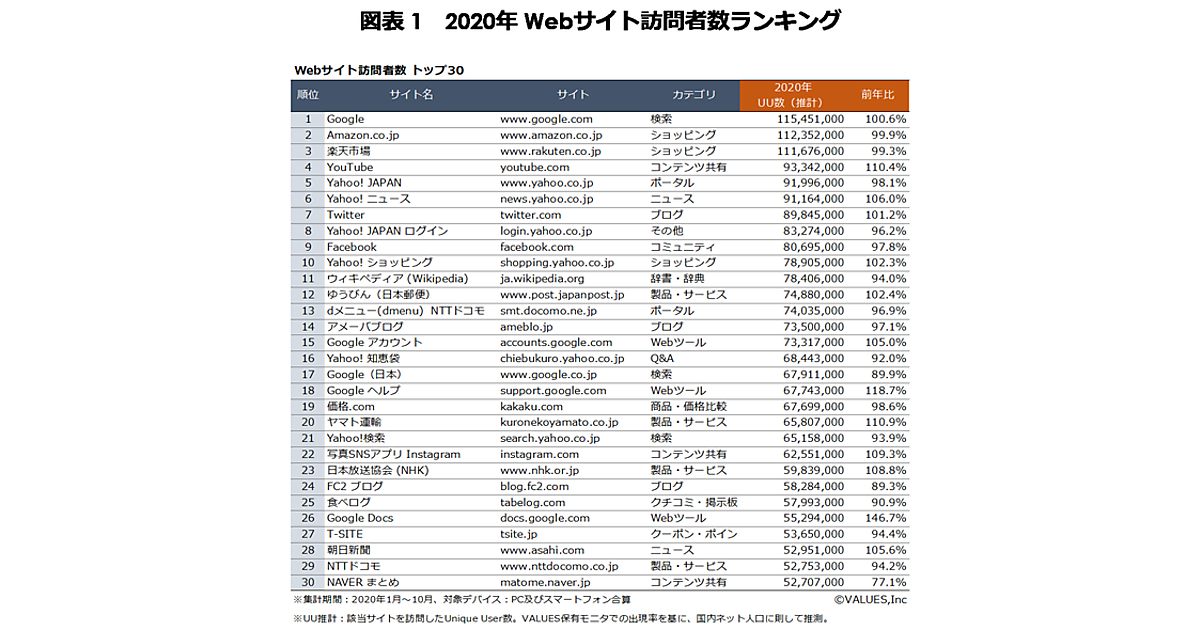 ヴァリューズは、「Webサイト&アプリ市場のユーザー数ランキング2020」を発表した。2020年(1月~10月)のWebサイトのアクセス数、スマートフォンのアプリの起動数を調査しランキングを作成している。