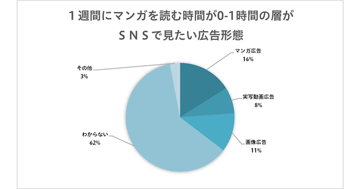 続いて同調査では、一般的なマンガとの接触時間と、SNS広告としてのマンガの関係を探っている。まず「マンガ(紙)とマンガアプリを含めて、1週間に何時間くらいマンガを読むか」(マンガの購読時間)を聞くと、「0~1時間」76%が最多で、2位の「1~3時間」15%と合わせて9割以上が、週3時間未満の“あまりマンガを読まない層”に属した。一方で、「0~1時間」しかマンガを読まない人たちに、「SNS広告において、もっとも見たい広告形態」をあらためて聞くと、「わからない」62%を除いて、「マンガ」16%は引き続き1位だった。