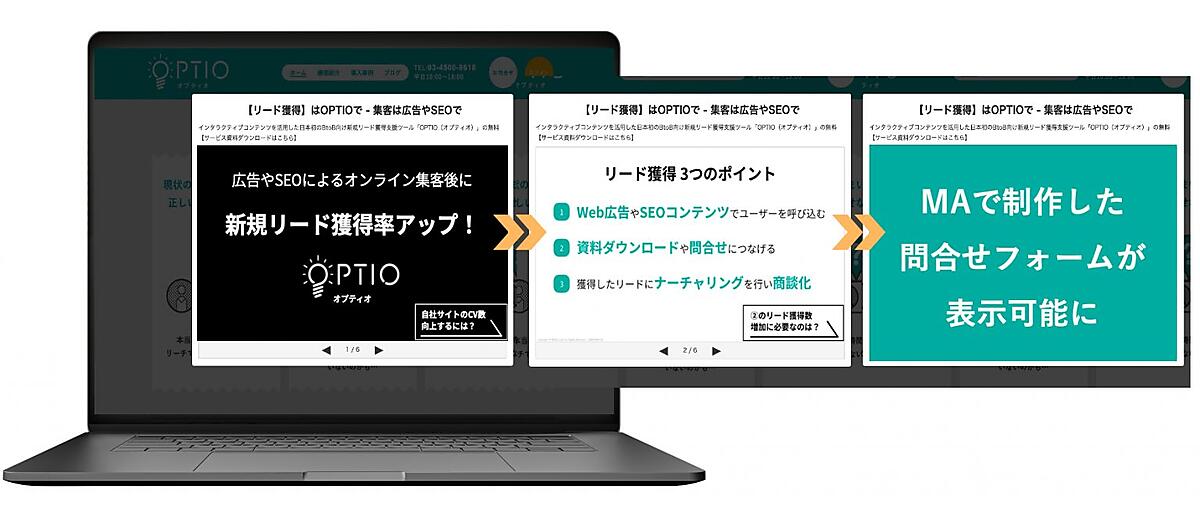 オプティオは、BtoB(企業間取引)に特化し、資料スライドや動画コンテンツをWebサイト上にポップアップ表示してリードを獲得するツール。スライドや動画と一緒に問い合わせフォームを表示し、ページ遷移せずに誘導する。今回の連携機能でオプティオのオリジナルフォームだけでなく、MAで制作した問い合わせフォームも組み込めるようになった。