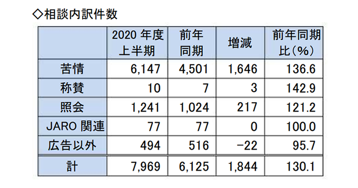 日本広告審査機構(JARO)は、2020年度上半期(2020年4月~9月)の審査状況を発表した。JAROが受け付けた広告・表示に対する相談について分析・集計した内容だが、今回は特に「新型コロナ関連」「動画広告・コンプレックス広告」「定期購入契約」の3つの分野への苦情を、トピックスとして採り上げている。