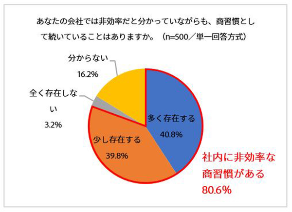 まず「社内に無駄な商習慣があるか」(非効率だとわかっていながらも商習慣として続いていることが社内にあるか)を聞くと、「多く存在する」40.8%、「少し存在する」39.8%となり、8割以上が無駄な商習慣を実感していた。