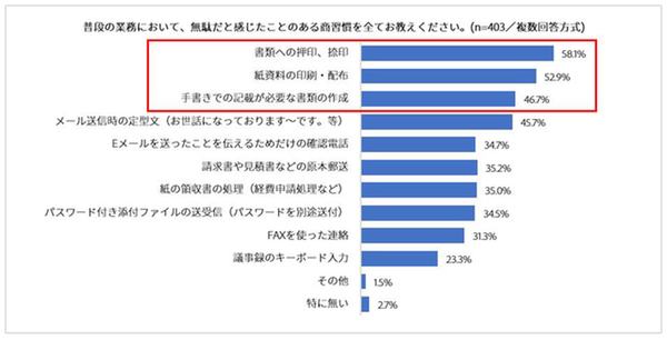 具体的な「無駄だと感じた商習慣」を聞くと、「書類への押印、捺印」58.1%、「紙資料の印刷・配布」52.9%、「手書きでの記載が必要な書類の作成」46.7%が上位だった。
