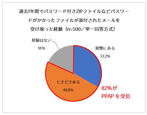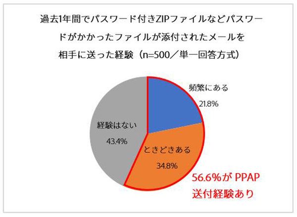 一方ここ最近、政府からも改めて無駄が指摘された「パスワード付ZIPファイルの送付」については、「過去一年以内に受け取ったことがある」82%、「自ら送付した」56.6%となり、多くの会社で惰性的に利用されていることが判明した。なお、この手順は「PPAP(P:パスワード付きZIP暗号化ファイルを送り、P:パスワードを別途送り、A:暗号化を行っている、P:プロトコル)」と呼ばれ、最近は批判を受けている。
