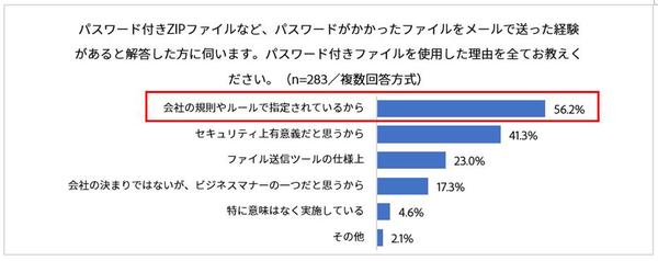 過去1年間にパスワード付きファイルをメールで送った経験があると回答した283名に、「パスワード付きファイルを使用した理由」を聞くと、「会社の規則やルールで指定されているから」56.2%が最多。「セキュリティ上有意義だと思うから」も4割以上だった。
