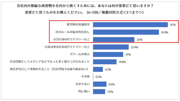こうした無駄な商習慣を無くすのに、何が重要だと思うかを聞いたところ、もっとも多かった回答は「経営陣の意識改革」47%、次いで「社内ルールの抜本的見直し」41.4%が特に多く、「自分自身のITリテラシー向上」26%がそれに続いた。