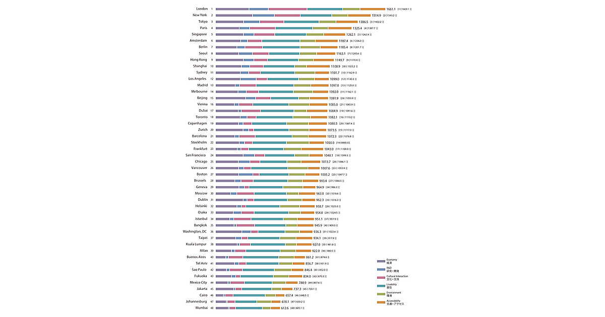 2020年の調査によると、総合ランキング1位は「ロンドン」で、2位「ニューヨーク」、3位「東京」、4位「パリ」、5位「シンガポール」がそれに続いた。この順位は前年と変わっていない。
