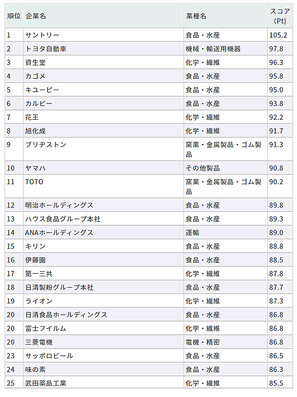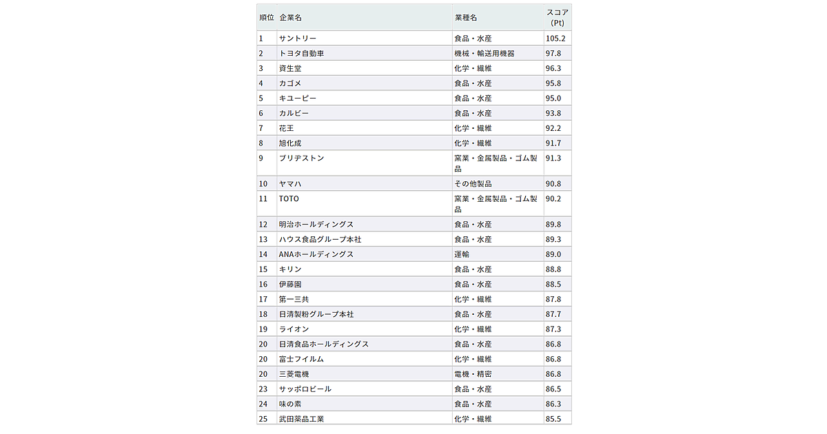 サントリーが2年連続トップに、2位のトヨタ自動車が大幅ランクアップ