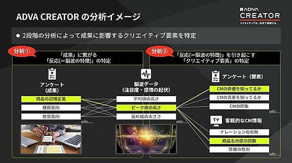 ADVA CREATORでは、まず脳波測定とアンケートを通してクリエイティブを構成する要素やクリエイティブの視聴者の反応をデータ化。次に、そこで取得したデータを分析することで成果向上を可能にする要素を特定し、改善点を示す。さらに、制作会社などと連携し、分析で特定した改善点を反映したクリエイティブ制作まで実施する。