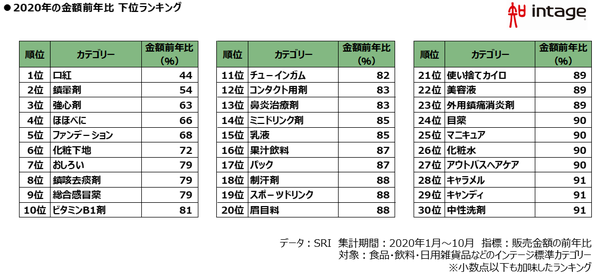 2020年の販売金額を前年比で見ると、ワースト1位は「口紅」(前年比44%)だった。花粉症の流行などもあり、日本は比較的マスク着用率が高いと言われている。コロナ禍によりそれがさらに進んだことで、口紅をしない人、口紅のマスク移りを気にする人、外出しないので化粧を控える人が増え、販売苦戦につながったと考えられる。
