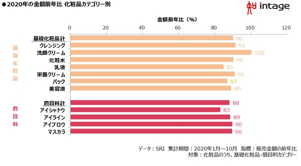 4位「ほほべに」66%、5位「ファンデーション」68%、6位「化粧下地」72%、7位「おしろい」79%も同様の理由が想定され、トップ10のうち半分が化粧品ジャンルに属していた。なお、化粧品カテゴリを細分化して見ると、基礎化粧品や眉・目の化粧品は売上をキープしていた。