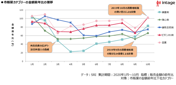 その他、「強心剤」「鎮咳去痰剤」「ビタミンB1剤」「目薬」などが低下したのは、訪日旅行者による購入が少なくなったためと考えられる。
