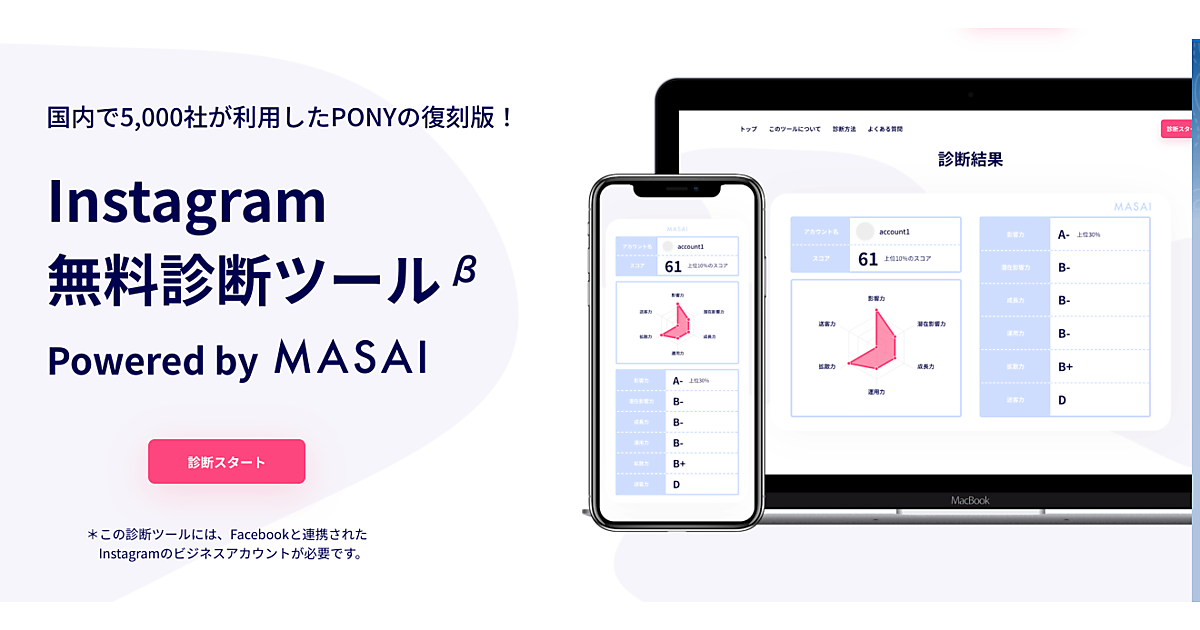 デジタルマーケティング支援でInstagram分析ツール「MASAI(マサイ)」を提供するパスチャーは、「Instagram無料診断ツール powered by MASAI」の提供を始めた、と12月16日に発表した。アカウントを伸ばしたいが難しい分析をせず無料で試したい企業向け。