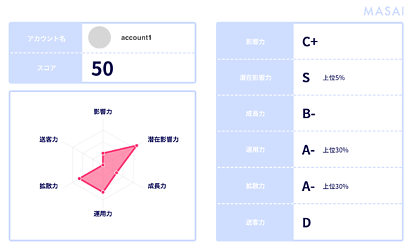 診断したいInstagramアカウントを選択してFacebook連携すると、診断結果を表示する。各診断項目は、影響力▽潜在影響力▽成長力▽運用力▽拡散力▽送客力--の6つの指標をもとに判断している。