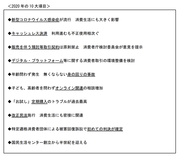 国民生活センターは、消費者問題に関する2020年の「10大項目」を発表した。「消費者問題として社会的注目を集めたもの」「消費生活相談が多く寄せられたもの」などから選定した内容だ。