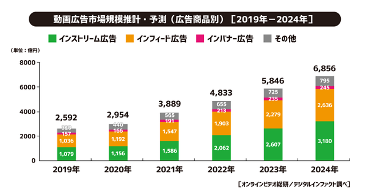 こうした動きの結果、2020年の動画広告市場は引き続き成長を見せ、2019年対比114%の2,954億円に達する見通しとなった。成長は今後も維持され、2021年には3,889億円、2024年には6,856億円に達すると予測されている。