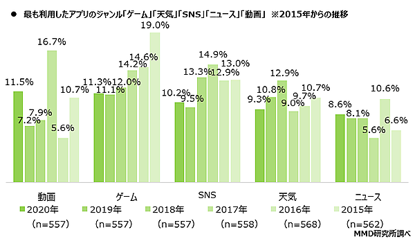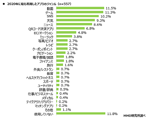 2020年にもっとも利用したアプリは「動画」「ゲーム」「SNS」