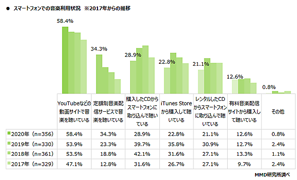 なお、「ミュージック」は3.8%に留まっているが、「スマホで音楽を聴くか」と聞くと、「聴いている」との回答は63.9%に達する。これらの利用者(n=356)に具体的な聴取方法を聞くと、「YouTubeなどの動画サイトで音楽を聴いている」58.4%、「定額制音楽配信サービスで音楽を聴いている」34.3%となり、“動画サービスで音楽聴取”という人も多いことが分かる。一方、定額制音楽配信サービスも急拡大しており、2017年の12.8%から急増し、3人に1人が利用者という状態になっている。