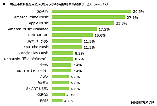 そこで定額制音楽配信サービス利用者(n=122)に、利用しているサービスを聞くと「Spotify」30.3%が、「Amazon Prime Music」27.9%、「Apple Music」23.8%を上回っていた。視聴時間に制限はあるが、Spotifyは無料サービスも提供している。一方Amazonは、プライム会員向けの「Amazon Prime Music」と、上位互換の「Amazon Music Unlimited」で票を分け合った面があると思われる。