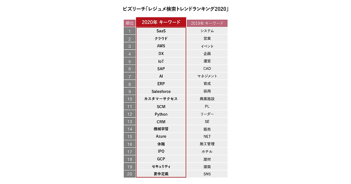 それによると、2020年のレジュメ検索において、検索キーワードの増加率トップ5は「SaaS(Software as a Service)」「クラウド」「AWS(Amazon Web Services)」「DX」「IoT」だった。いずれのワードも2019年のランキングには入っておらず、急激なトレンドの変化をうかがわせる。