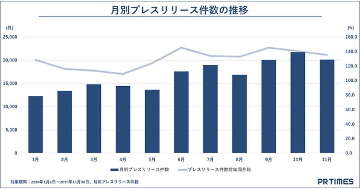 同社が運営するプレスリリース配信サービス「PR TIMES」は現在4万3,000社超が利用しており、2020年(1月1日~11月30日)の期間に、18万4,050件のリリースが配信されたという。