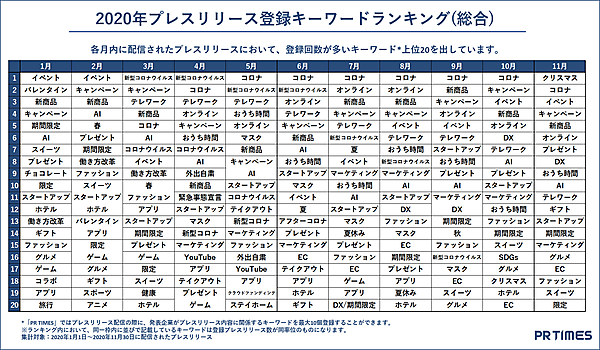 PR TIMESは、2020年に同社が配信したプレスリリースを対象に、年間データ分析と総括、業界別分析と各種ランキングなどを発表した。