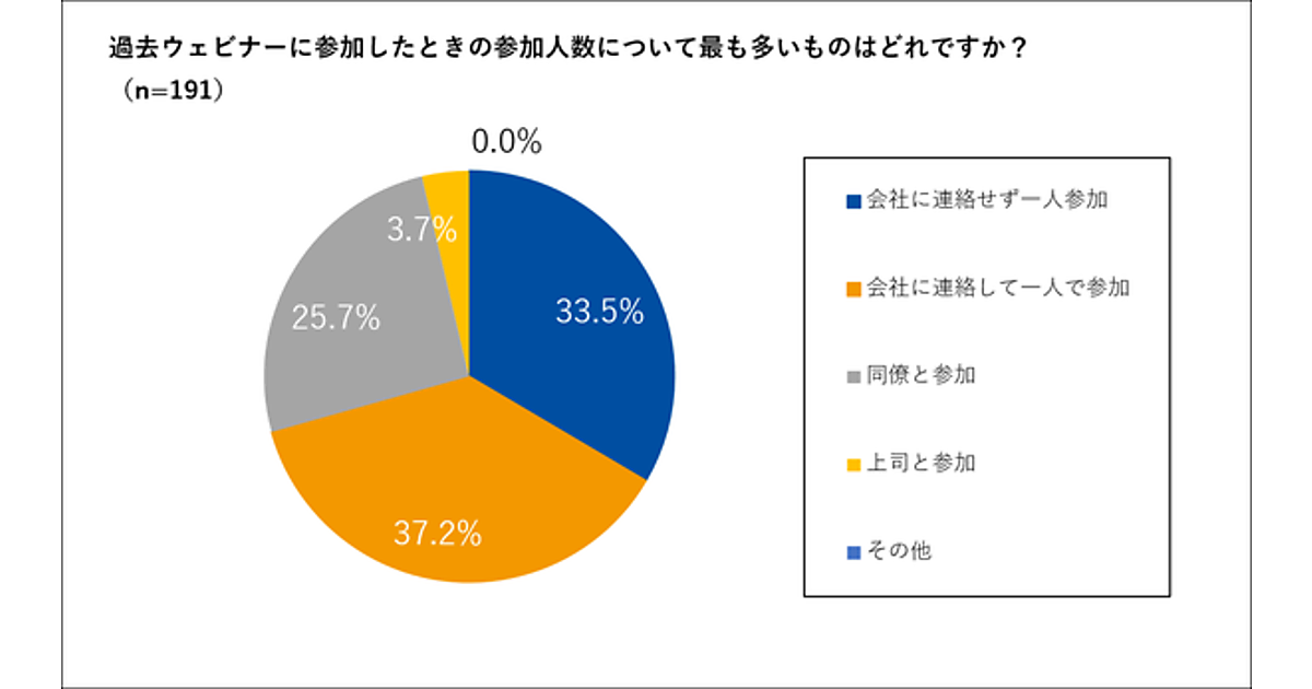 まず「ウェビナーへの参加経験」を聞くと、883人のうち参加経験者は191人(21.6%)。「参加した人数」について聞くと、「会社に連絡せず1人参加」33.5%、「会社に連絡して1人で参加」37.2%、「同僚と参加」25.7%、「上司と参加」3.7%と、“ひっそり参加”“1人で参加”“みんなで参加”の3パターンにほぼ分かれた。「会社に連絡せず1人で参加」と「会社に連絡して1人で参加」を合わせると、1人で参加した人は7割を超えている。