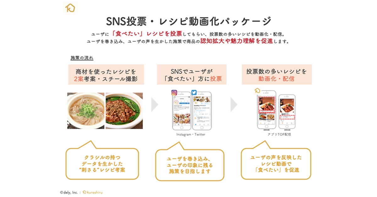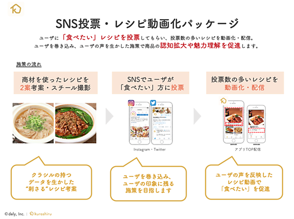レシピ動画サービス「クラシル」を運営するdelyは、消費者の嗜好(しこう)をプロモーションに反映する新規広告商品「SNS投票・レシピ動画化パッケージ」の販売を始めた、と1月6日に発表した。クラシルのユーザーがSNSで「食べたい」レシピを投票し、投票数の多いレシピを動画化して配信する。ユーザーのリアルな声を生かすことで動画広告の好感度を最大化し、商品の認知拡大を促進できる。