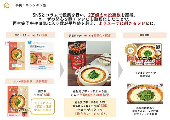 第1弾としてモランボンが製造・販売する「熟成濃厚キムチチゲ用スープ」の広告を企画・配信した。ふたつのレシピをクラシルの「Instagram」と「Twitter」で公開し、「どちらを食べたいか」をユーザーが投票。クラシル内のコラムでも商品の理解促進を図った。投票は2万7586票、コラム読了率は平均比160%で、レシピ動画を配信する前から高いアテンションを獲得した。
